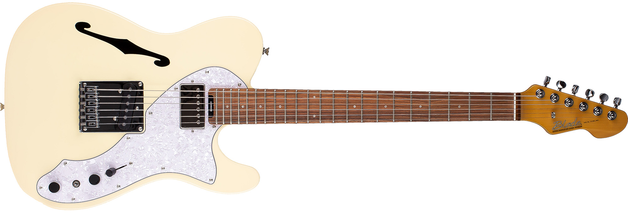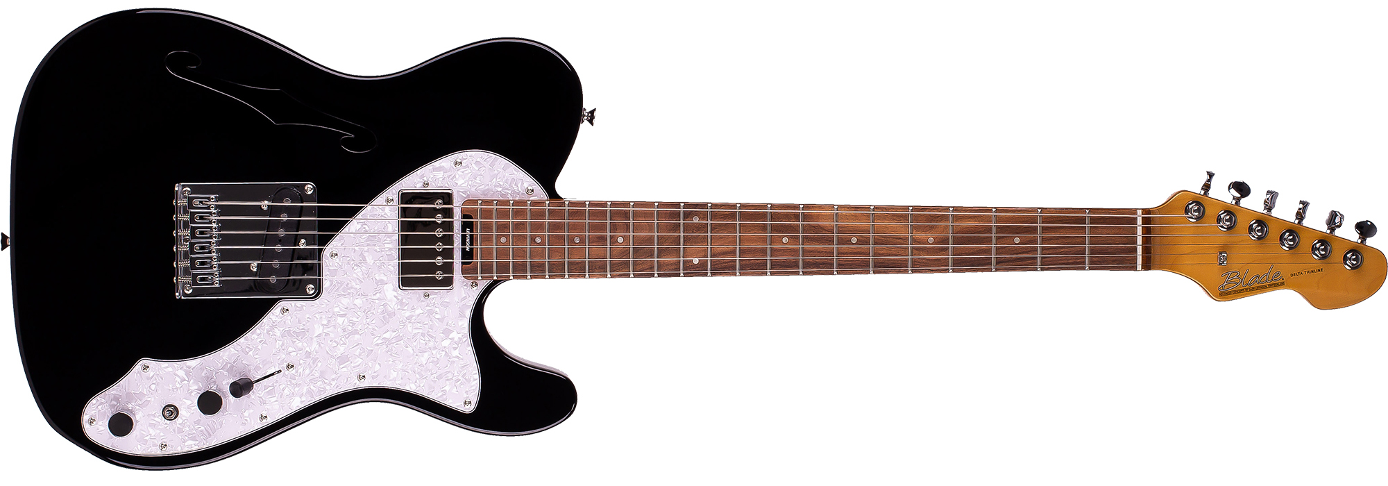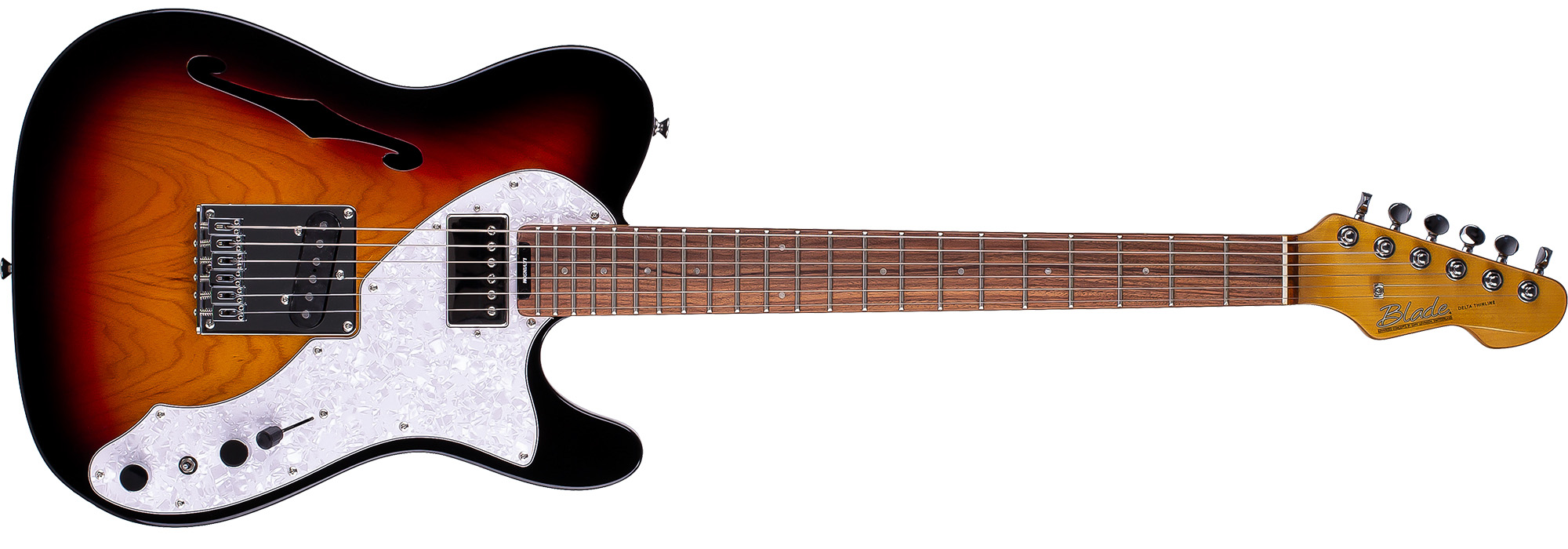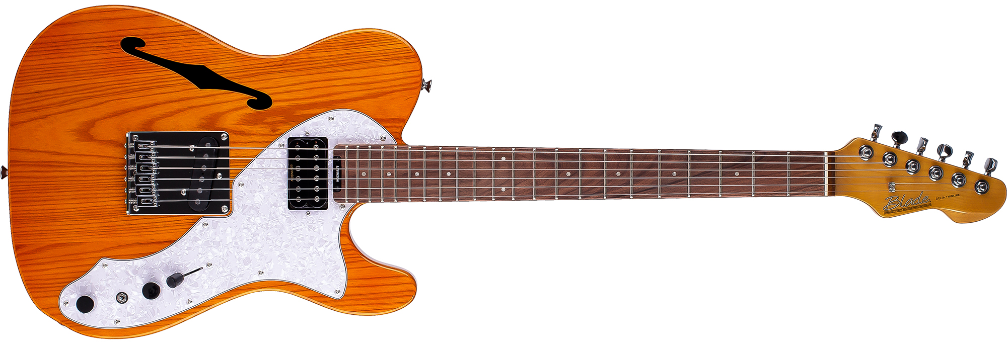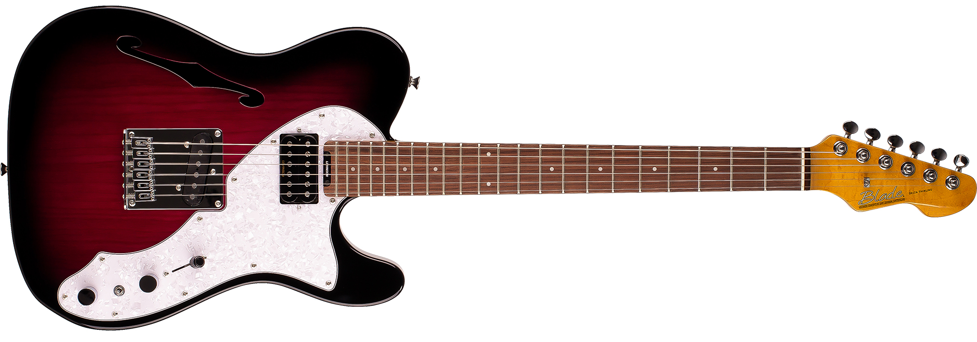 The BLADE® THH Thinline brings you the best in classic design with a vastly expanded tonal range of the VSC-4 Variable Spectrum Control. The F-hole construction and semi-hollow construction of the North American alder body dramatically reduces weight and increases playing comfort. The graceful pickguard complements the beautifully translucent finished ash-capped body. The overwound Levinson T-42 bridge pickup has great bite and the LN-22 neck delivers exceptional clarity with great harmonics. Six individual saddles on the classic style bridge guarantee perfect intonation. The BLADE® THH Thinline truely defines magic tone and mystical feel.